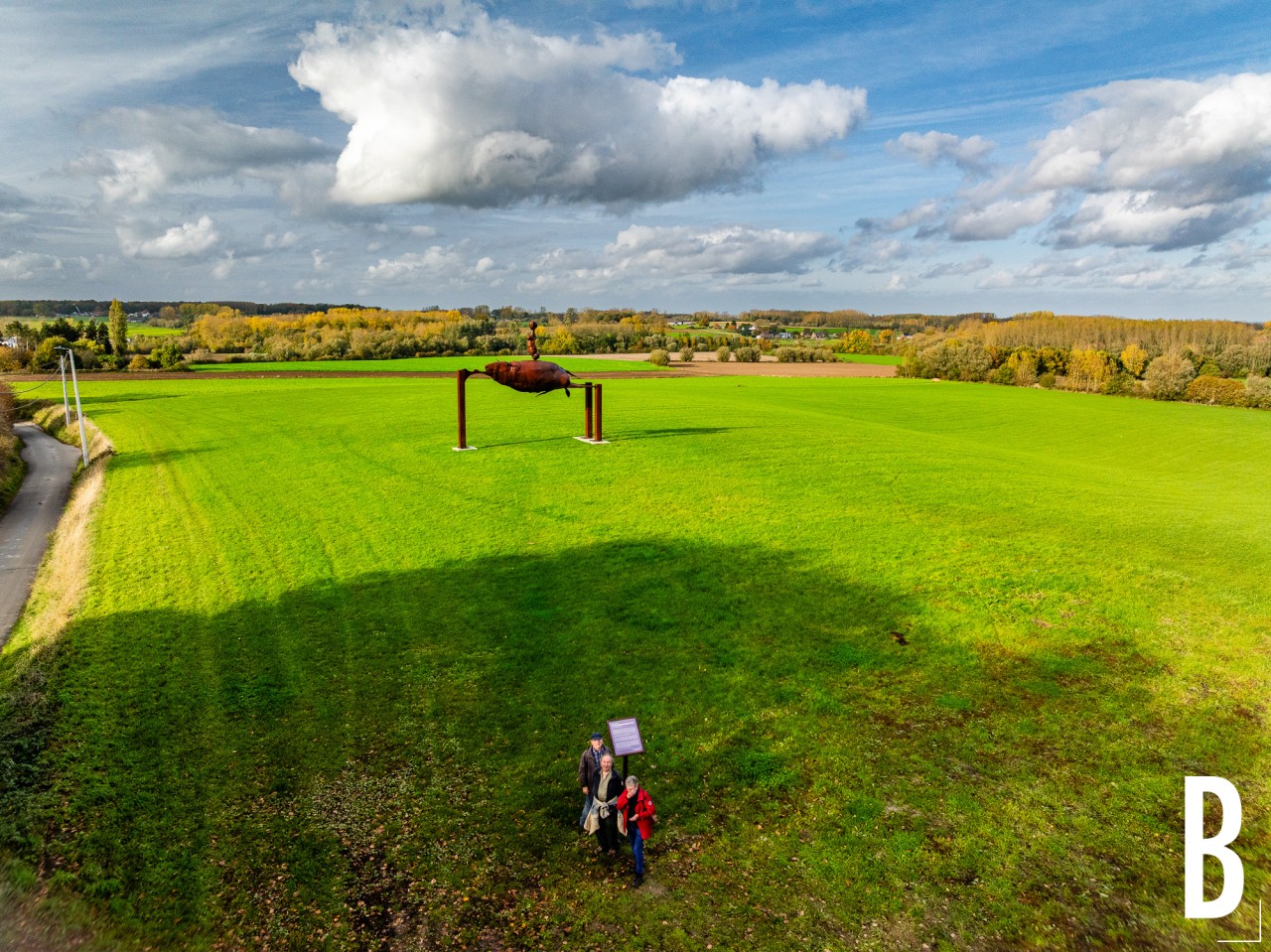 Luchtfoto van de indrukwekkende sculptuur in het landschap van het Pajottenland.