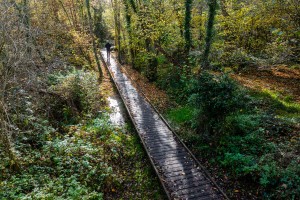 Drone-opname van de historische watermolen en de omgeving in herfstkleuren.