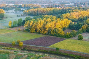 Dronebeeld van de bochtige rivier in de Demervallei tijdens een sfeervolle zonsondergang.