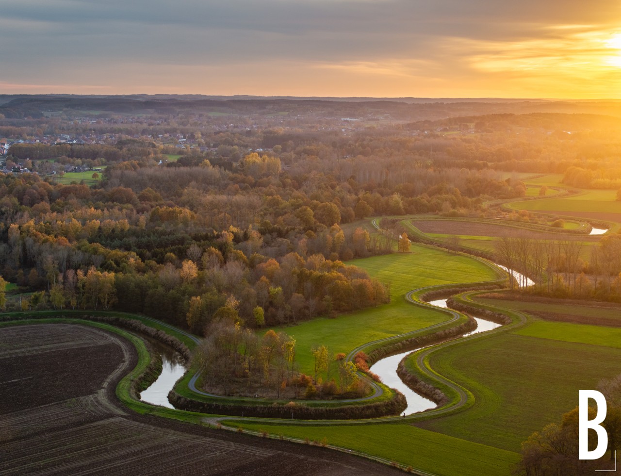 Dronebeeld van de bochtige rivier in de Demervallei tijdens een sfeervolle zonsondergang.