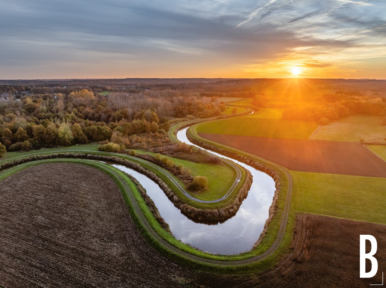 Dronebeeld van de bochtige rivier in de Demervallei tijdens een sfeervolle zonsondergang.
