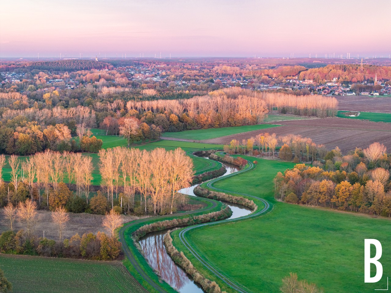 Dronebeeld van de bochtige rivier in de Demervallei tijdens een sfeervolle zonsondergang.