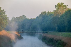 Een rimpelloze kreek in het moerasgebied zorgt voor perfecte weerspiegelingen.