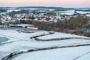 Dronebeeld van de besneeuwde dorpskern en de kerk in de winterse Dijlevallei.