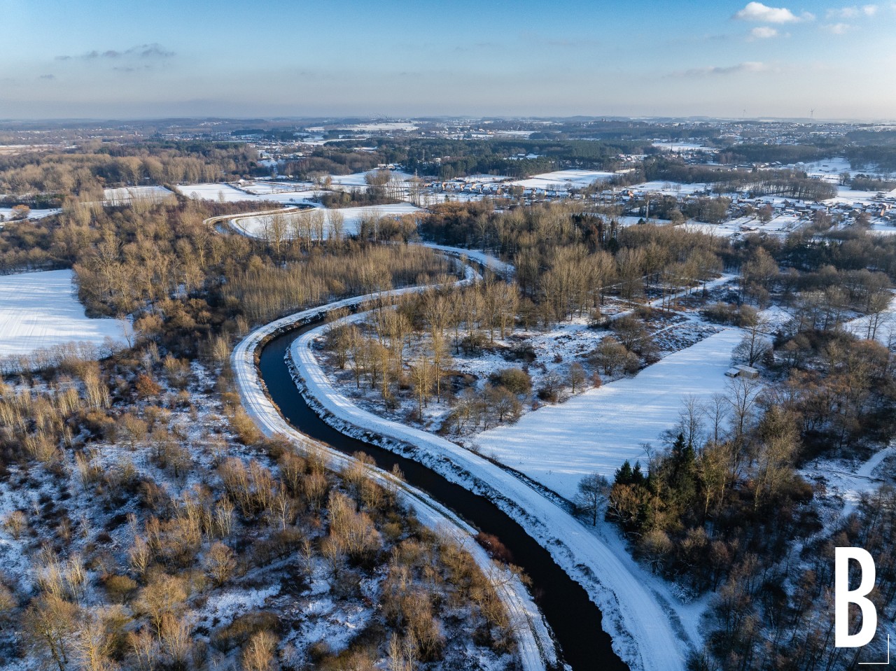 Dronebeeld van de meanderende rivier in een sprookjesachtig wit Testelt.