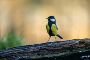 Zicht op een koolmees (Parus major) tijdens een voederbeurt in de winter.