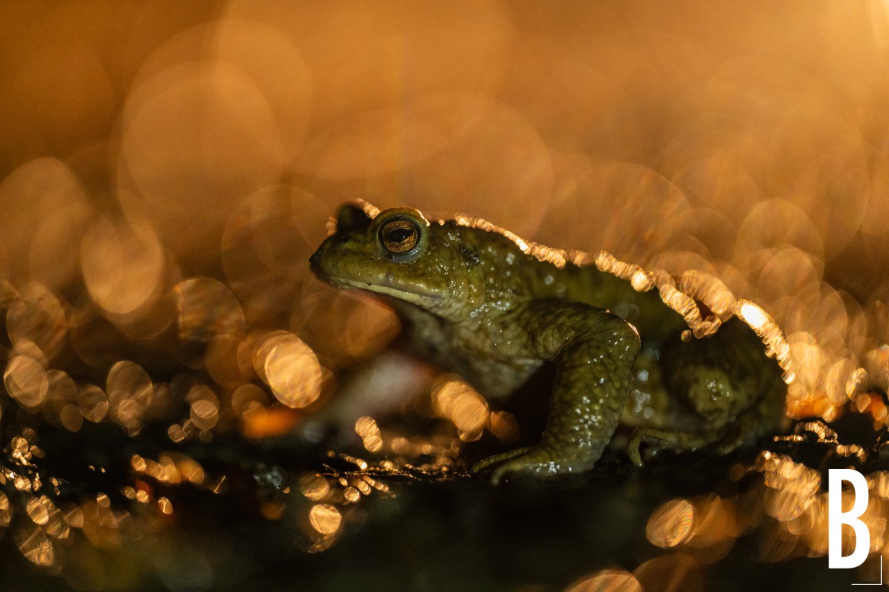 Een gewone pad tijdens de paddentrek nabij natuurreservaat het Burreken tijdens een regenachtige nacht.