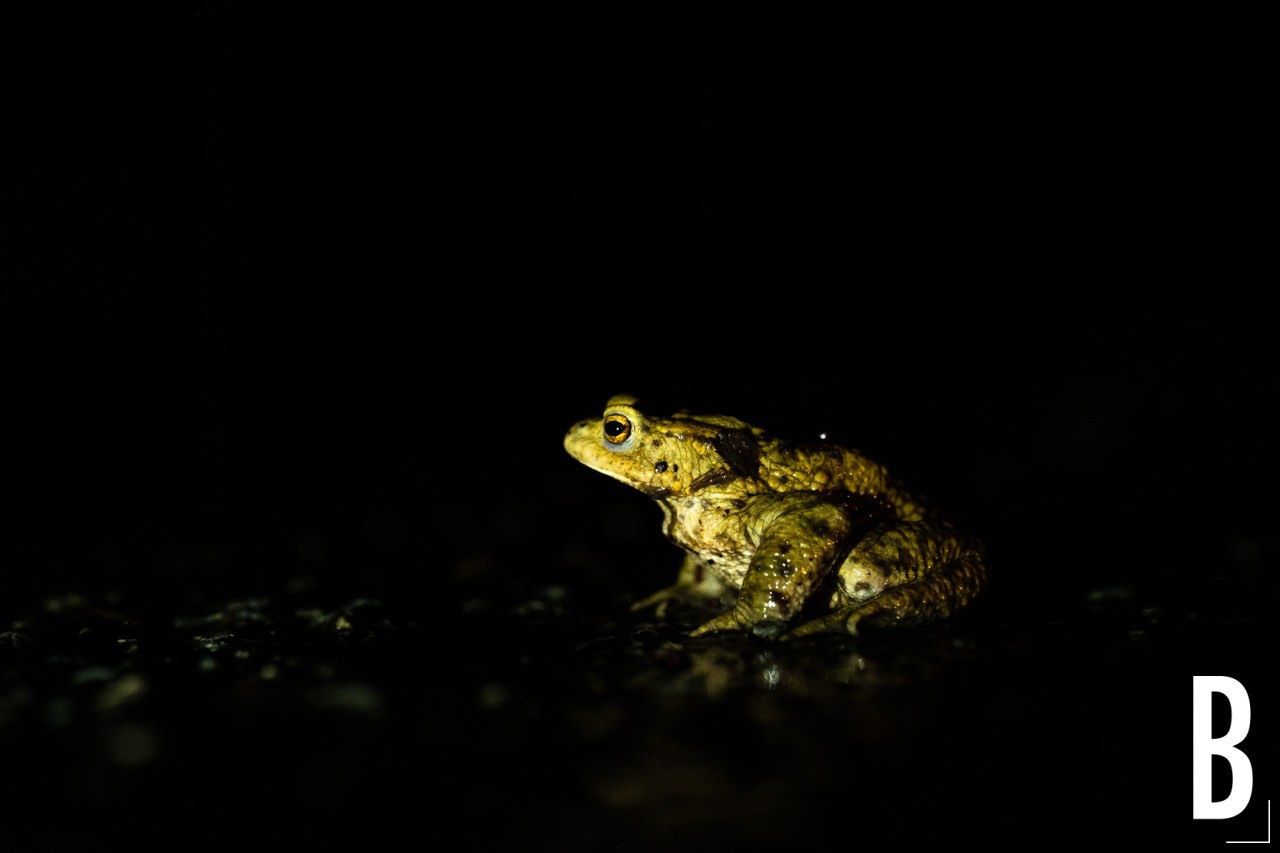 Een gewone pad tijdens de paddentrek nabij natuurreservaat het Burreken tijdens een regenachtige nacht.