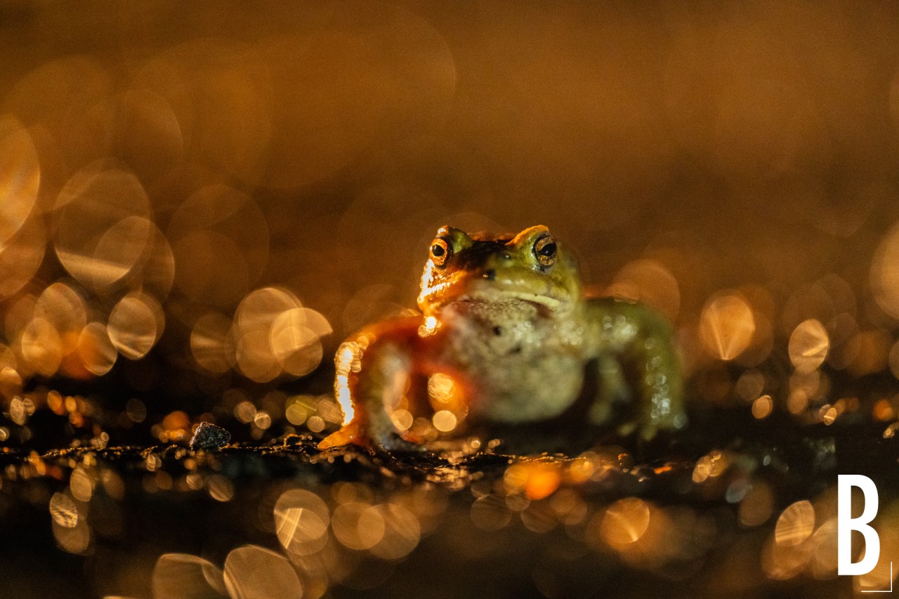 Een gewone pad tijdens de paddentrek nabij natuurreservaat het Burreken tijdens een regenachtige nacht.