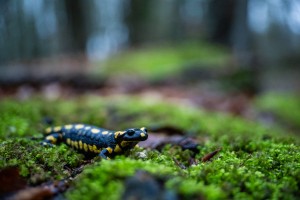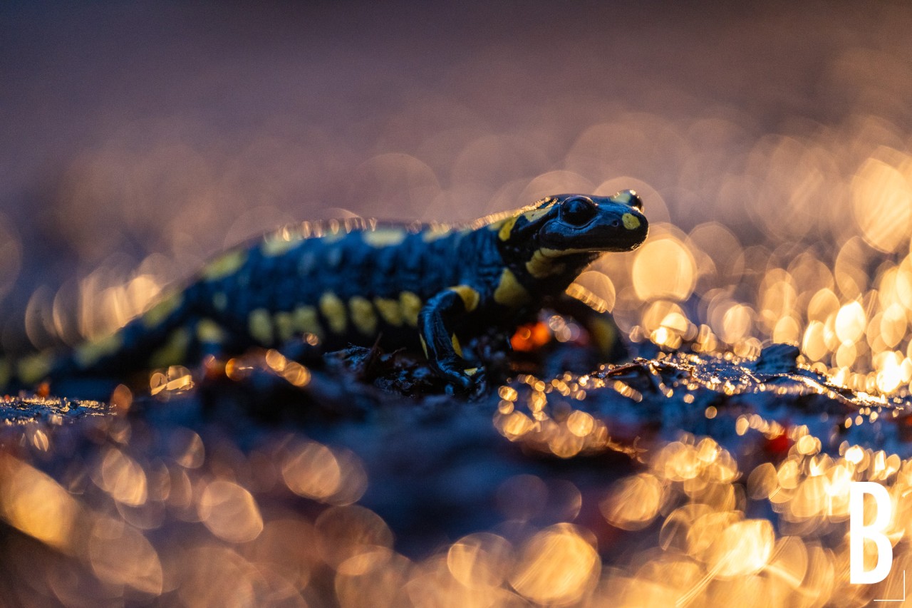 Vuursalamander tijdens de amfibiëentrek nabij natuurreservaat Het Burreken tijdens een regenachtige nacht.