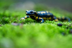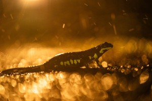 Vuursalamander tijdens de amfibiëentrek nabij natuurreservaat Het Burreken tijdens een regenachtige nacht.