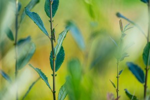 Een moerrassprinkhaan verbergt zich tussne het gebladerte van ene jonge wilg in het Turnhouts vennengebied.