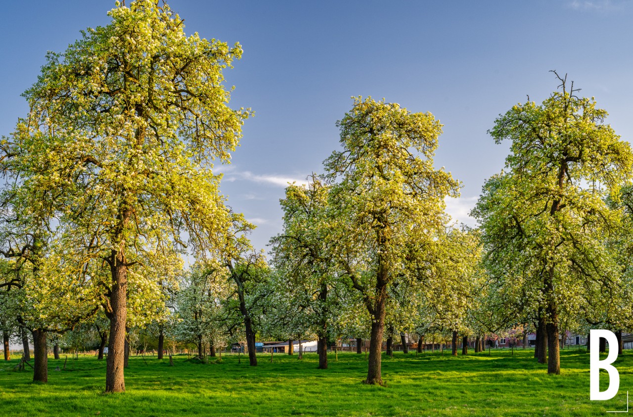 Bloeiende perenboomgaard in linter