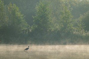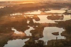 Natuurgebied De Luysen met haar talrijke vijvers gezien vanuit de lucht op een mooie avond in de late zomer.