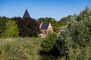 De rivier slingert sierlijk door de witte velden van Testelt in dit sfeervolle luchtbeeld.