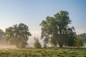 Warm ochtendlicht breekt door de nevel boven het landschap.