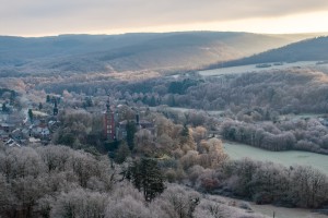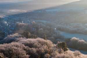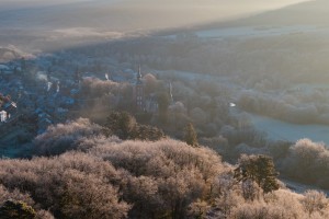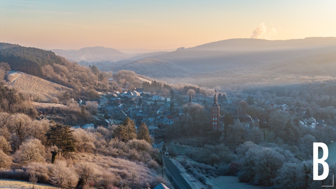Luchtfoto van het heuvelachtige landschap bij Vierves-sur-Viroin tijdens een winterprik.