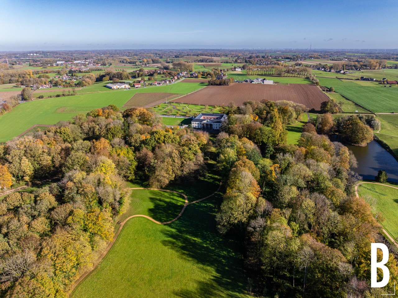 Droneopname van het historische kasteel en de omliggende tuinen in volle herfstkleur.