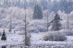 Een groep runderen in een besneeuwde weide op het platteland bij Baraque Fraiture.