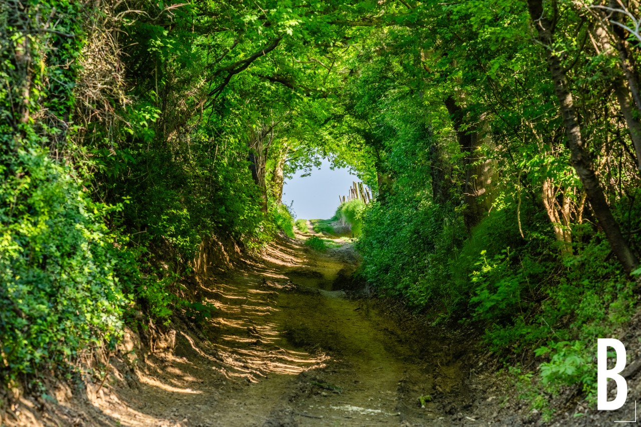 Zonlicht filtert door de bomen boven een diepe veldweg.