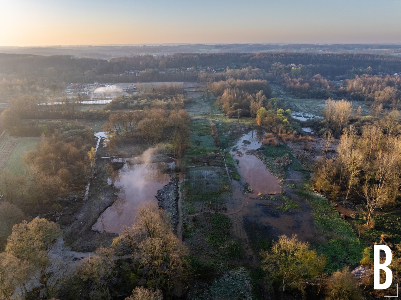 Luchtfoto van het moeras in natuurreservaat vorsdonkbos-turfputten in de mist tijdens de ochtend te betekom.