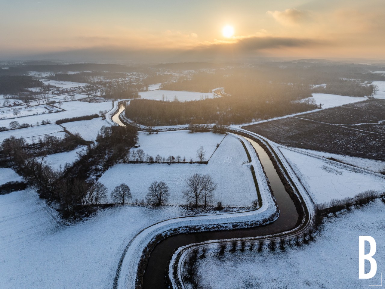 De kronkelende patronen van de Demer worden geaccentueerd door de sneeuw in dit dronebeeld boven Testelt.