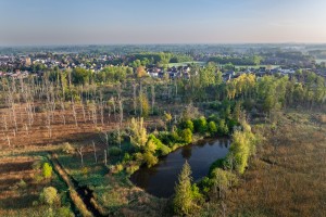 Bloeide heide van natuurgebied Opglabbekerzavel gezien vanuit de lucht.