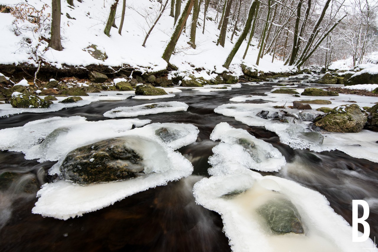 IJs en sneeuw langs de bevroren rivier De Hoëgne tijdens de winter.