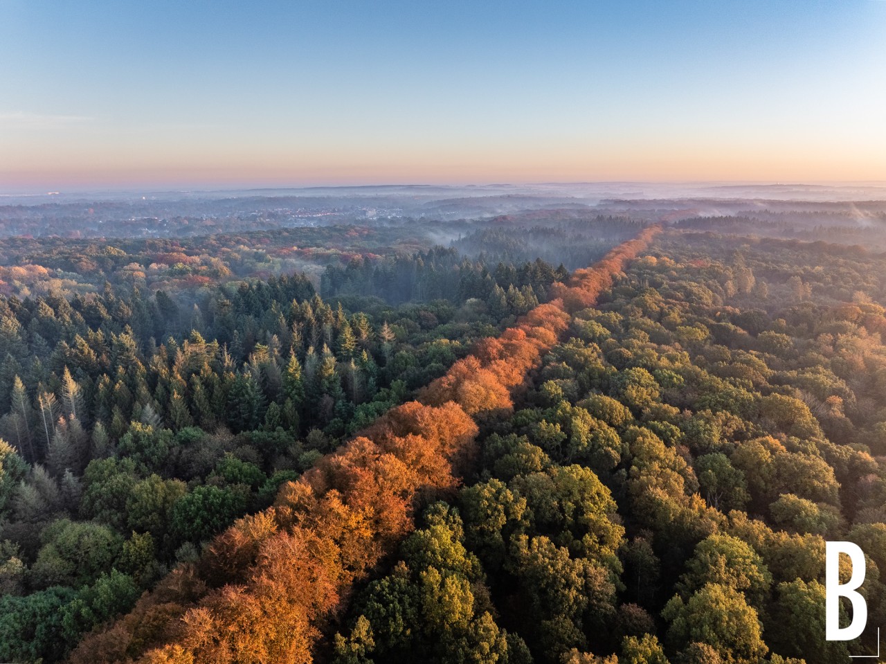 Het kleurrijke Zonienwoud gezien vanuit de lucht op een mistige najaarsochtend.