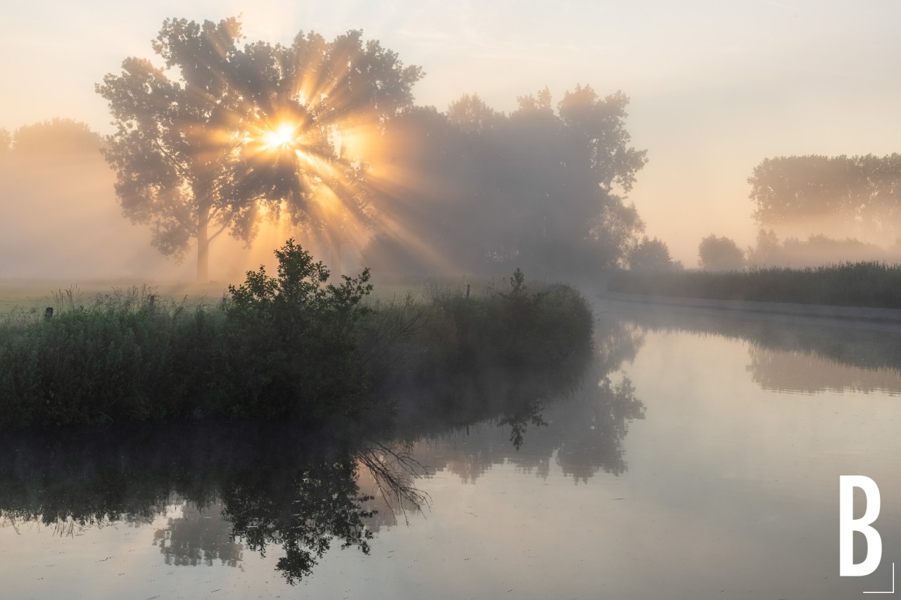 Prachtige zonnestralen breken door de mist in de meersen van Grimminge.