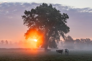 Zicht op de waterloop in de Langemeersen bij het aanbreken van de dag.