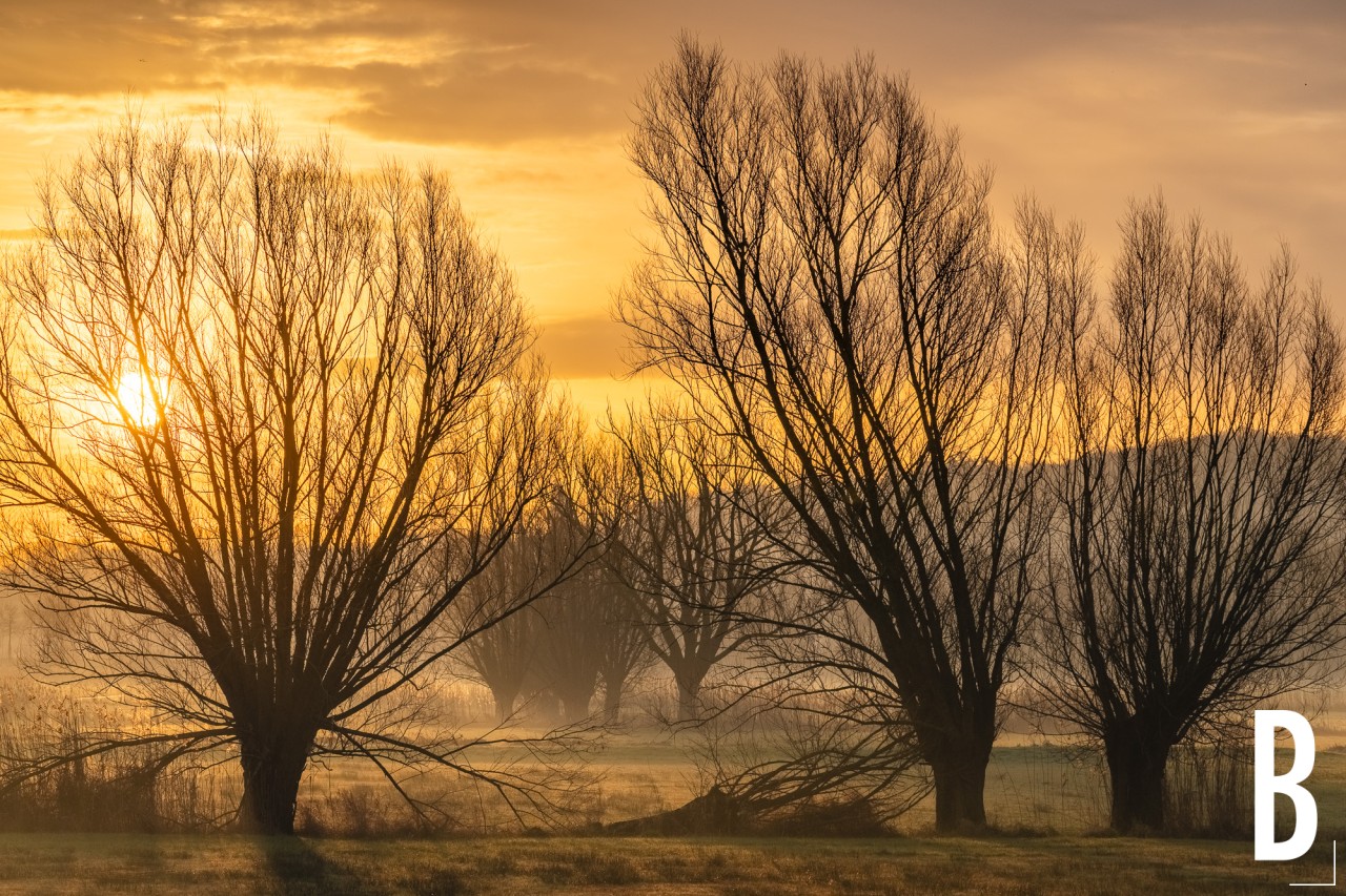 HDR opname van de winterse zonsopgang en knotwilgen in Wortegem-Petegem.