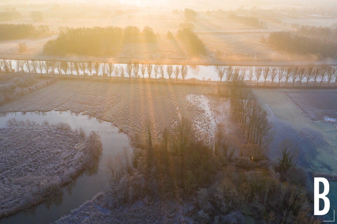 Luchtfoto van de Schelde met velden en bomen met zonnestralen tijdens zonopgang in de winter