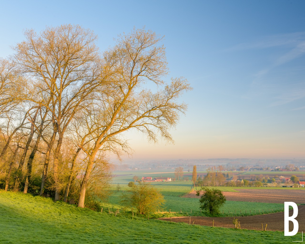 Zicht op de Scheldevallei vanaf de flanken van de Kortekeer op een nbevelige lenteochtend in de Vlaamse Ardennen.