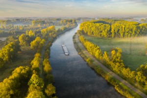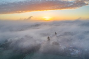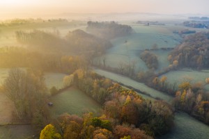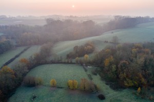 Luchtfoto van velden en bomen van natuurreservaat het Burreken bij ochtendmist tijdens de herfst