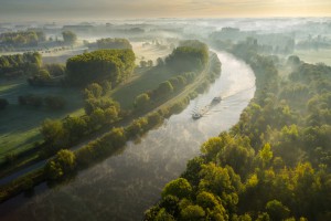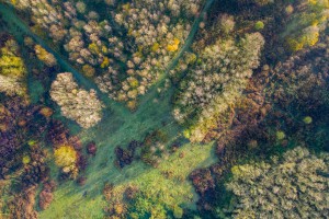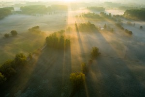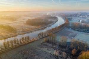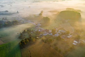 Luchtfoto van velden en bomen van natuurreservaat het Burreken bij ochtendmist tijdens de herfst