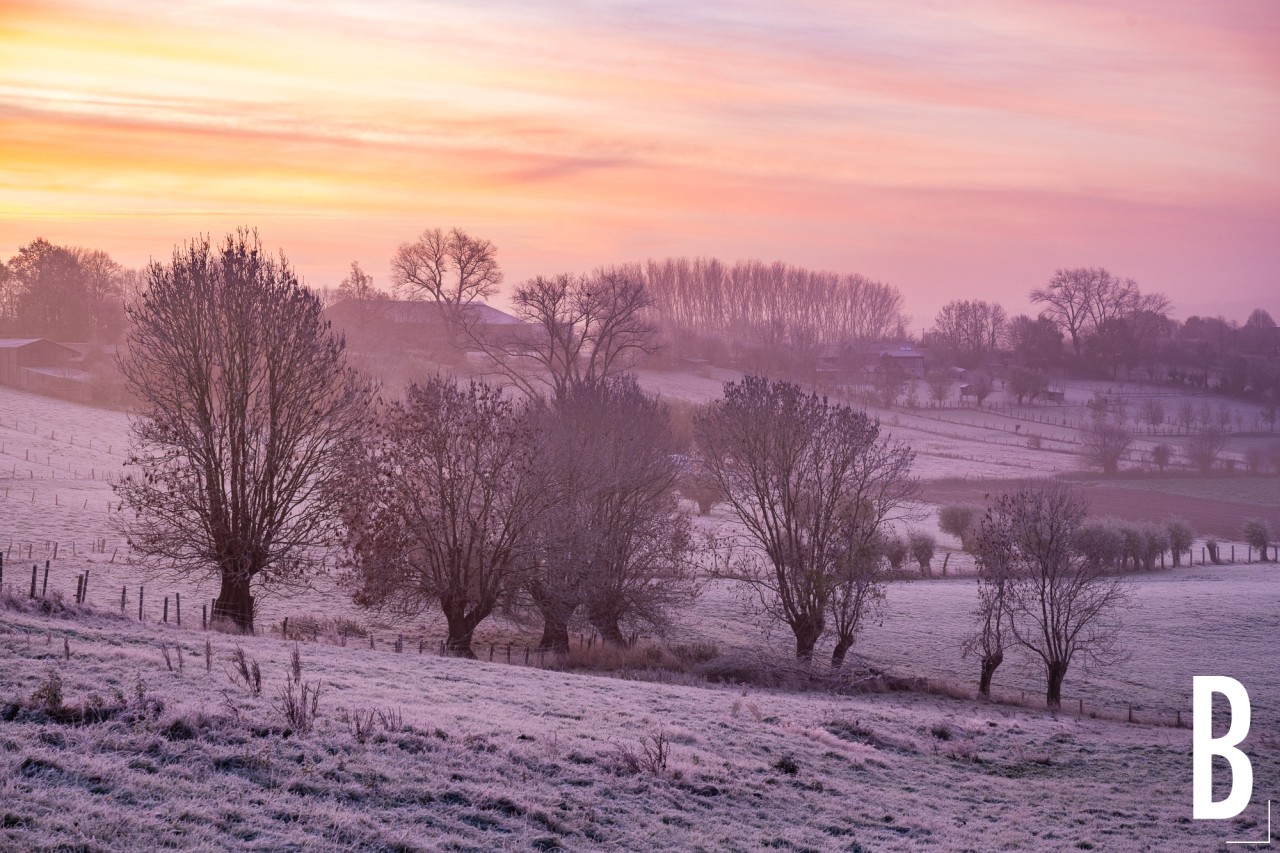 Zicht op de berijpte knotbomen en het glooiende bocagelandschap van de Vlaamse Ardennen.
