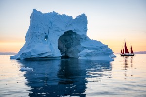 Ijsbergen verspreid over de zee onder een zachte zomeravondlucht.