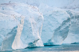 Gigantische ijsbergen drijven rond en reflecteren in het water rondom Rode O.