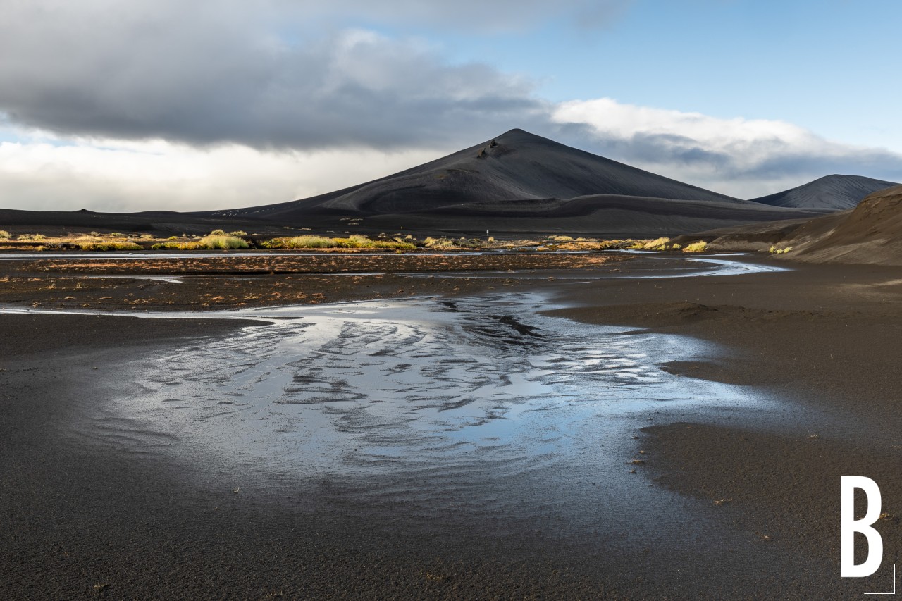 De blauwe lucht reflecteert in het drijfzand in de aswoestijn van Veidivatn. Een conische berg steekt boven het zwarte landschap uit.