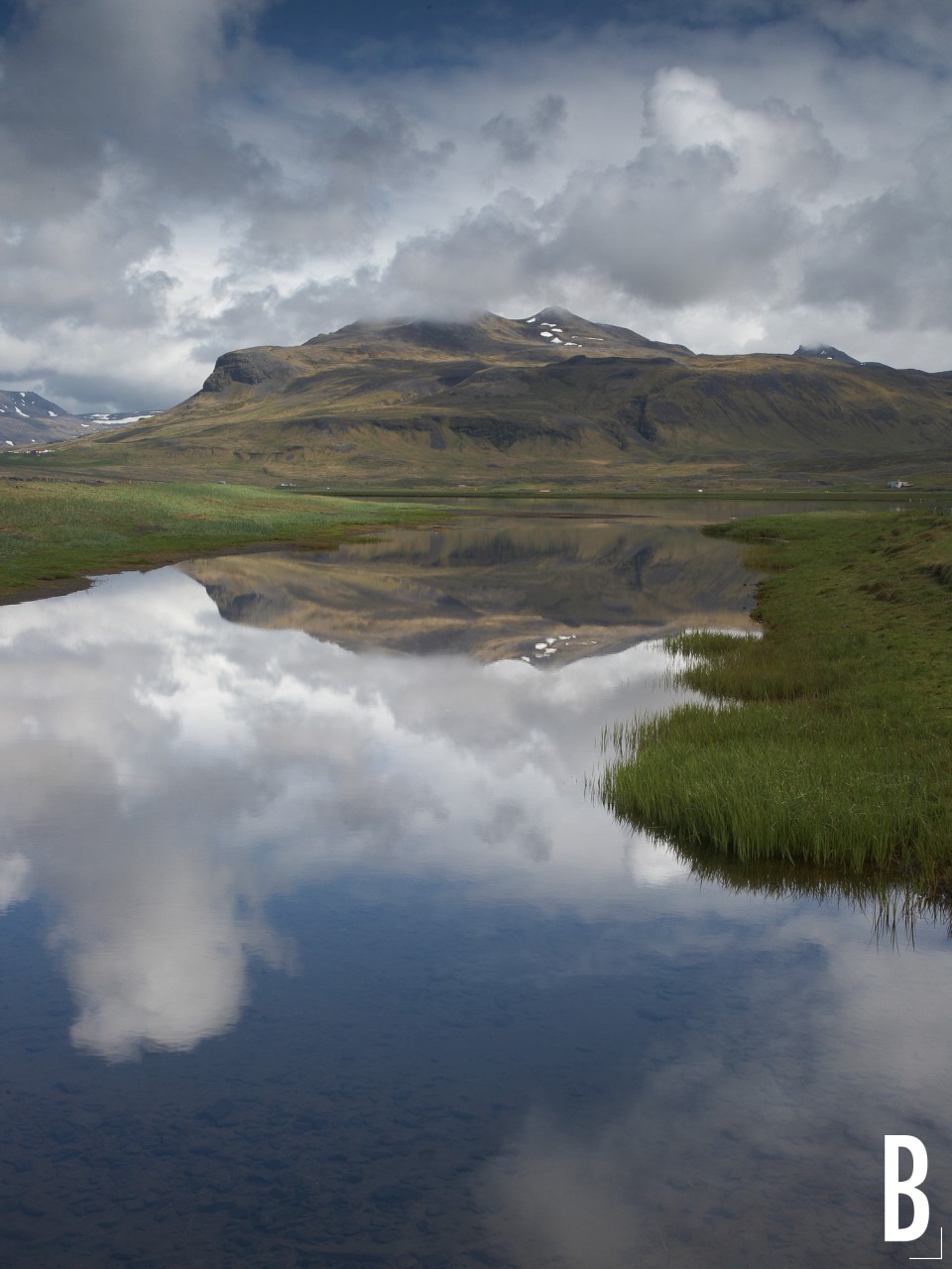 Meer met bergen en wolken weerspiegeld in het gladde water.