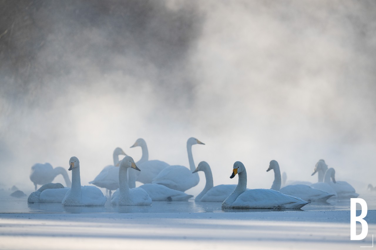 Zicht op de zwanen op het water gehuld in de nevel tijdens de ochtend te kussharo.