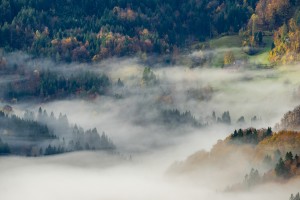Zicht op de kerk en de heuvels in de mist tijdens de ochtend te spodnja sorica.