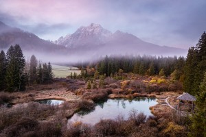 Zicht op de juliaanse alpen en hun weerspiegeling in het meer van natuurreservaat zelenci te podkoren.