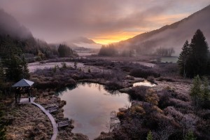 Zicht op de juliaanse alpen en hun weerspiegeling in het meer van natuurreservaat zelenci te podkoren.