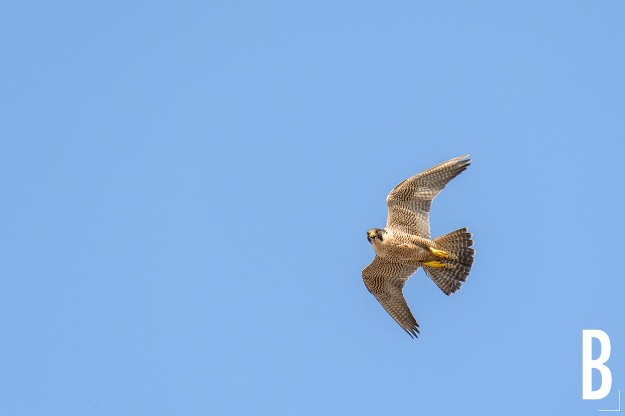 Een volwassen slechtvalk (Falco peregrinus) vliegend rond de Sint-Walburgakerk te Oudenaarde.
