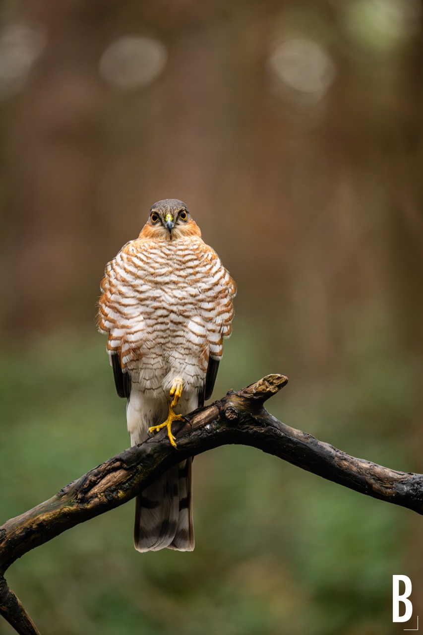 Een mannetje sperwer (Accipiter nisus) observeert de omgeving vanuit het bos in Putte.