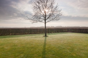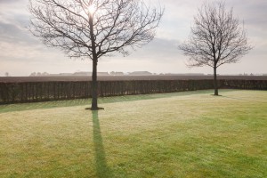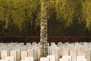 Rijen met grafmonumenten en twee bomen op de achtergrond op de oorlogsbegraafplaats in Dozingem