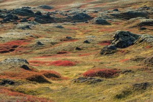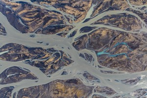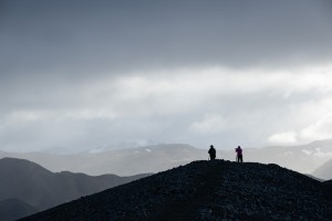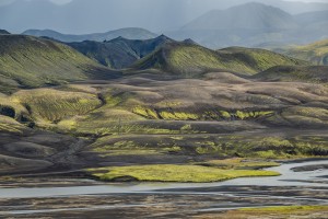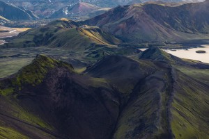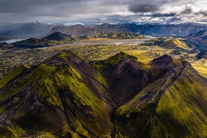 Luchtfoto van het vulkanische landschap in het binnenland van IJsland. De iconische Maelifell rijst op uit de uitgestrekte aswoestijn van Mælifellssandur, omringd door bergen, rotsen en dreigende wolken