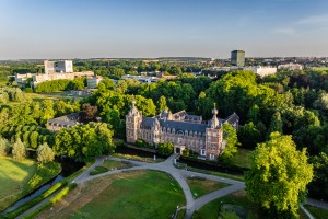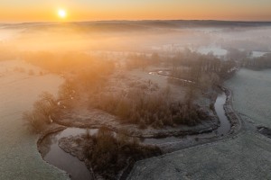 Luchtfoto van het dorp Melden gehuld in de mist tijdens de zonsopgang in de winter.
